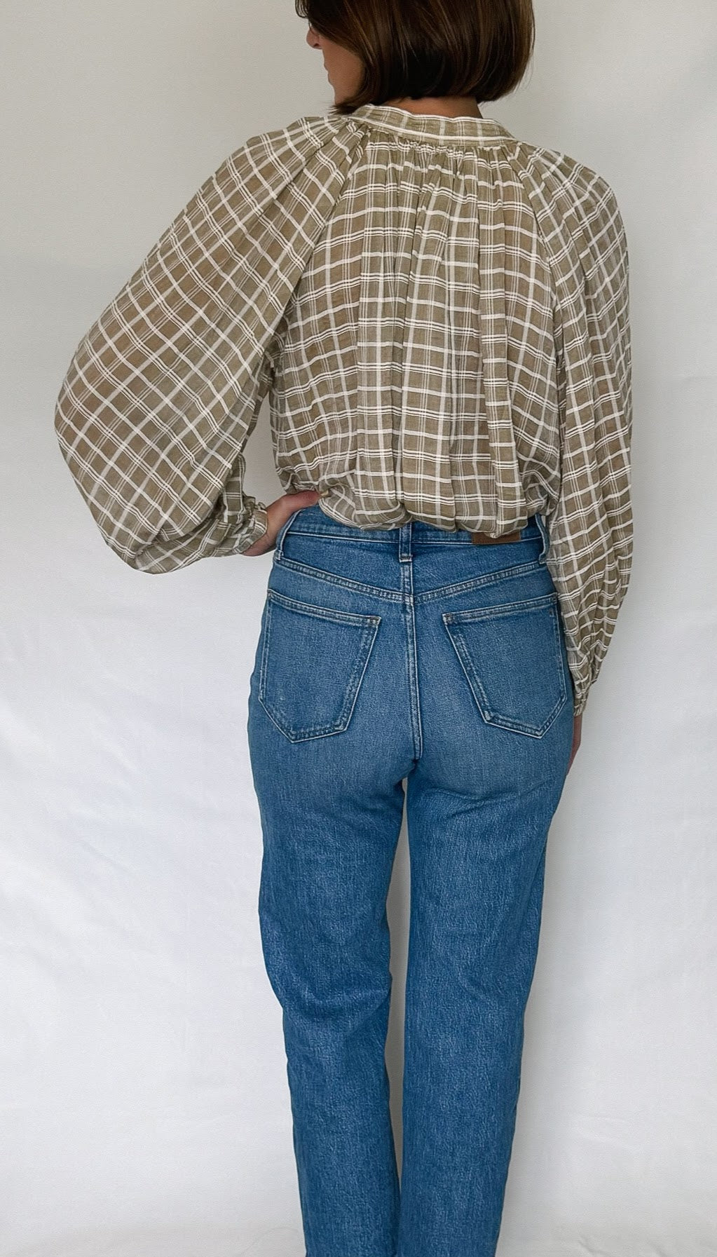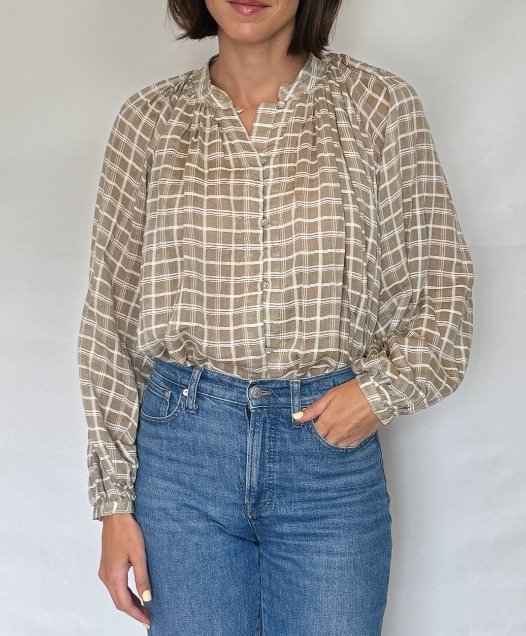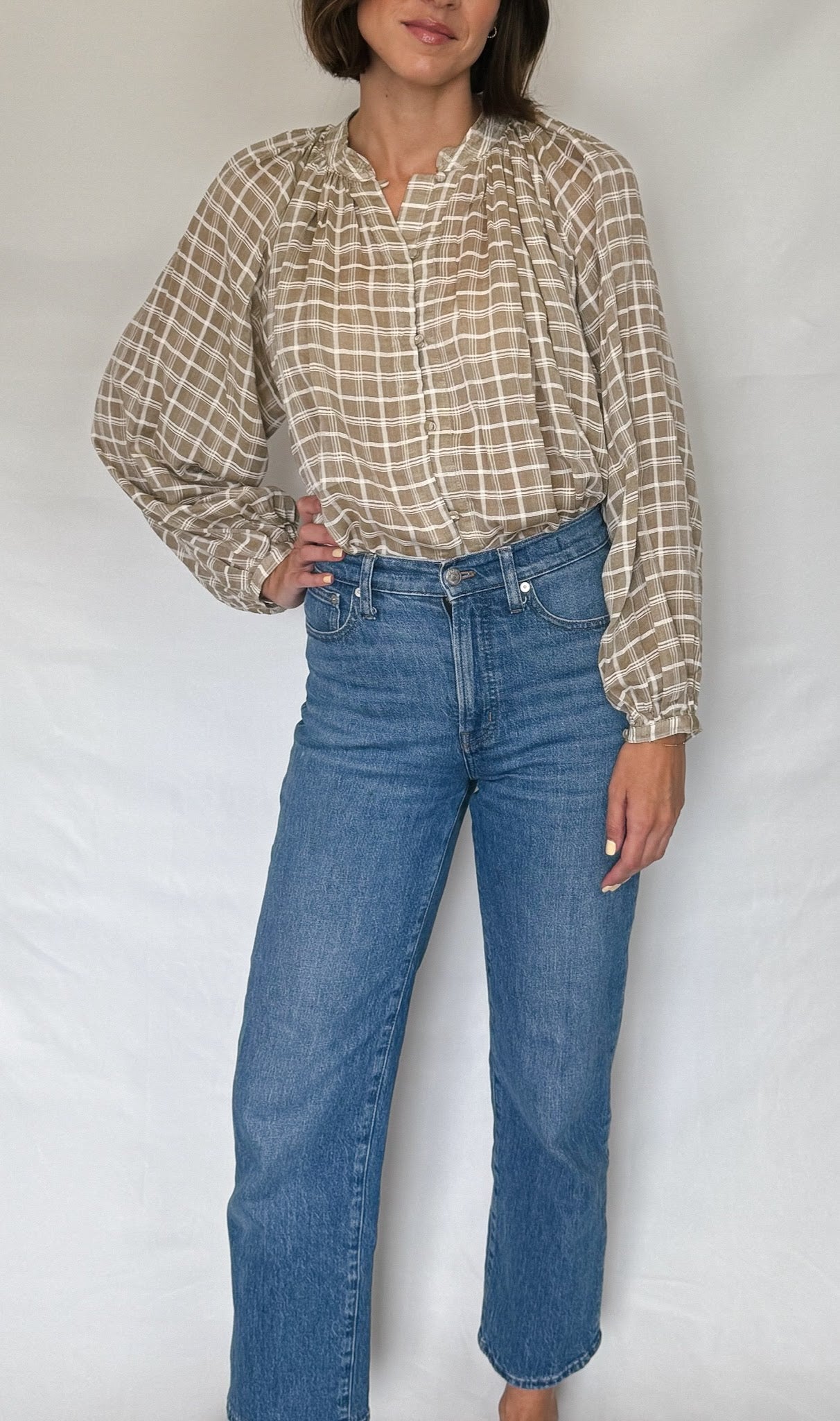 This effortlessly chic blouse blends comfort and style with its soft sand and ivory plaid print. This blouse is perfect tucked into your favorite jeans for a casual daytime sophisticated look.