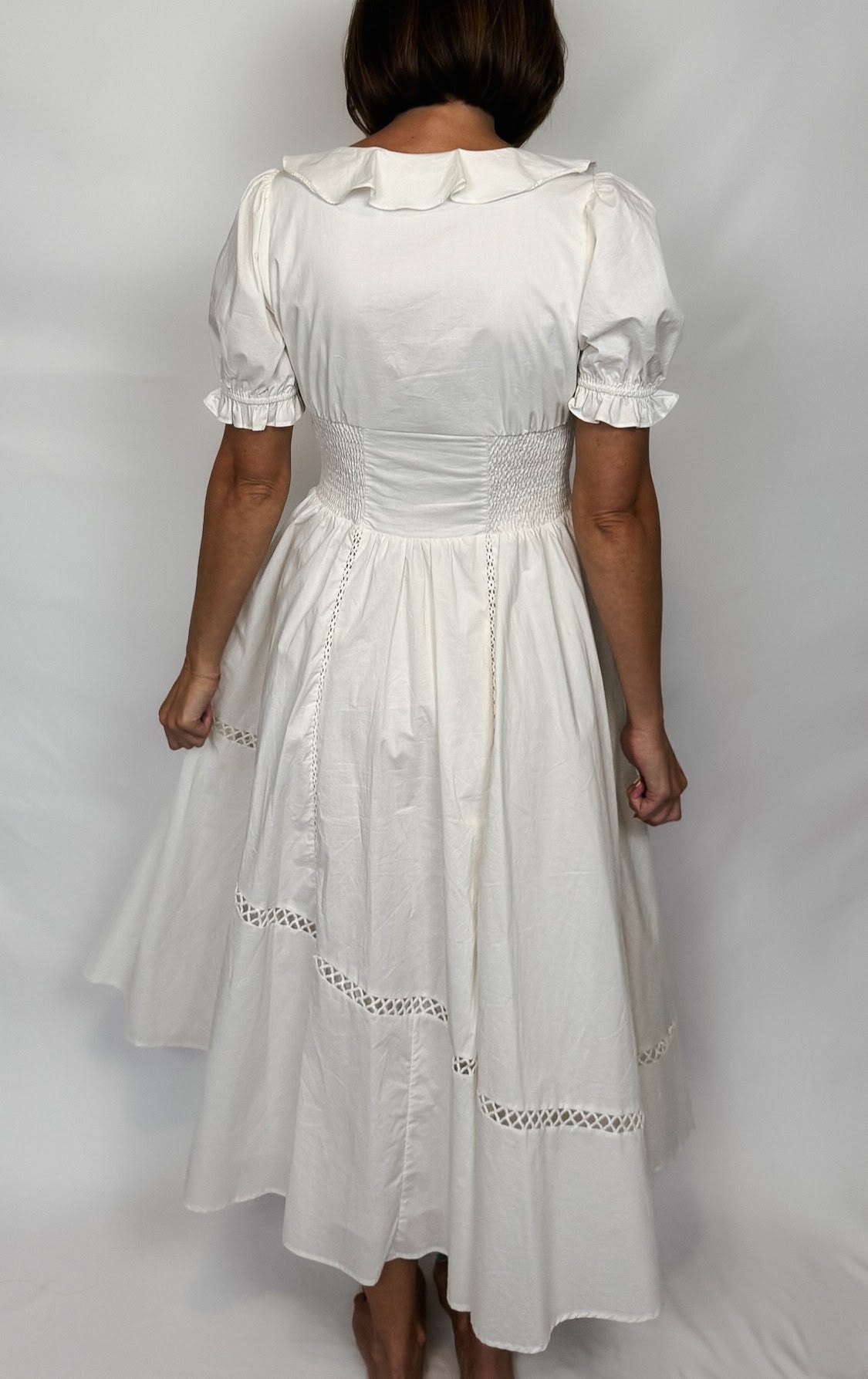 Channel timeless charm with this romantic, vintage-inspired white cotton midi dress. Featuring puffed short sleeves, a flattering square neckline with delicate ruffle details. This dress effortlessly blends classic elegance with casual comfort. Perfect for warm days, garden parties, or a breezy weekend look.